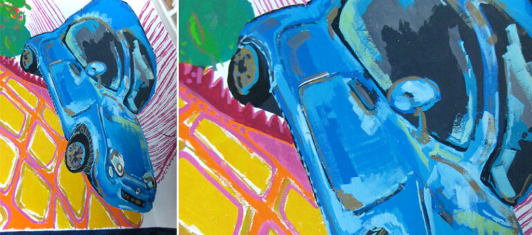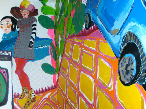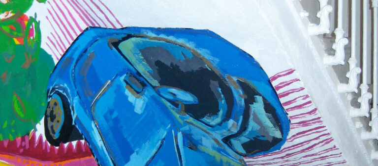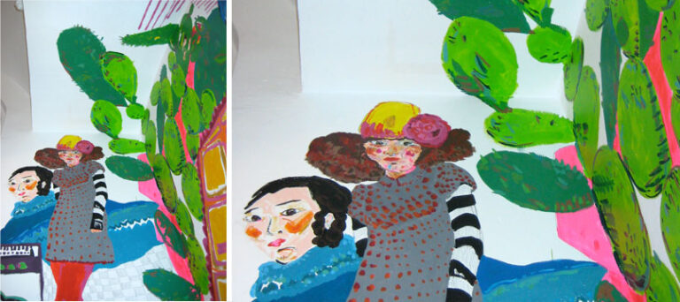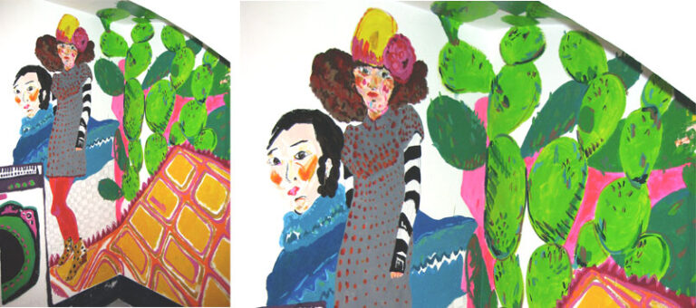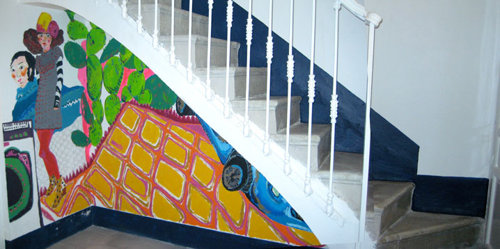 Realicé un mural en las paredes de una casa particular, ubicado debajo de una escalera, un espacio íntimo y cargado de singularidad. La obra buscaba contar una historia, donde se fusionaban mis elementos gráficos característicos con la arquitectura del lugar, transformando un rincón cotidiano en un escenario narrativo y visual.